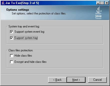 1. Download the latest Jar2Exe Wizard 1.7 . 2. When creating exe, let 'event log' and 'system tray' checked: